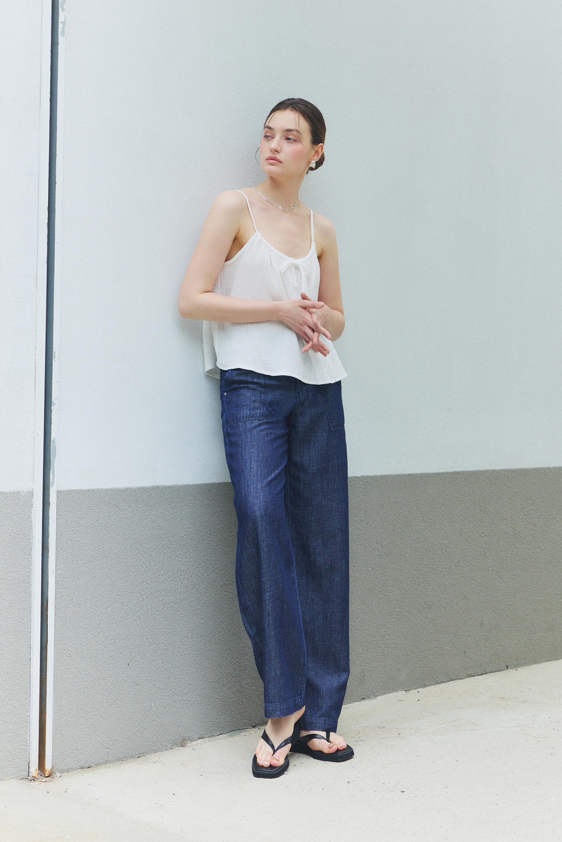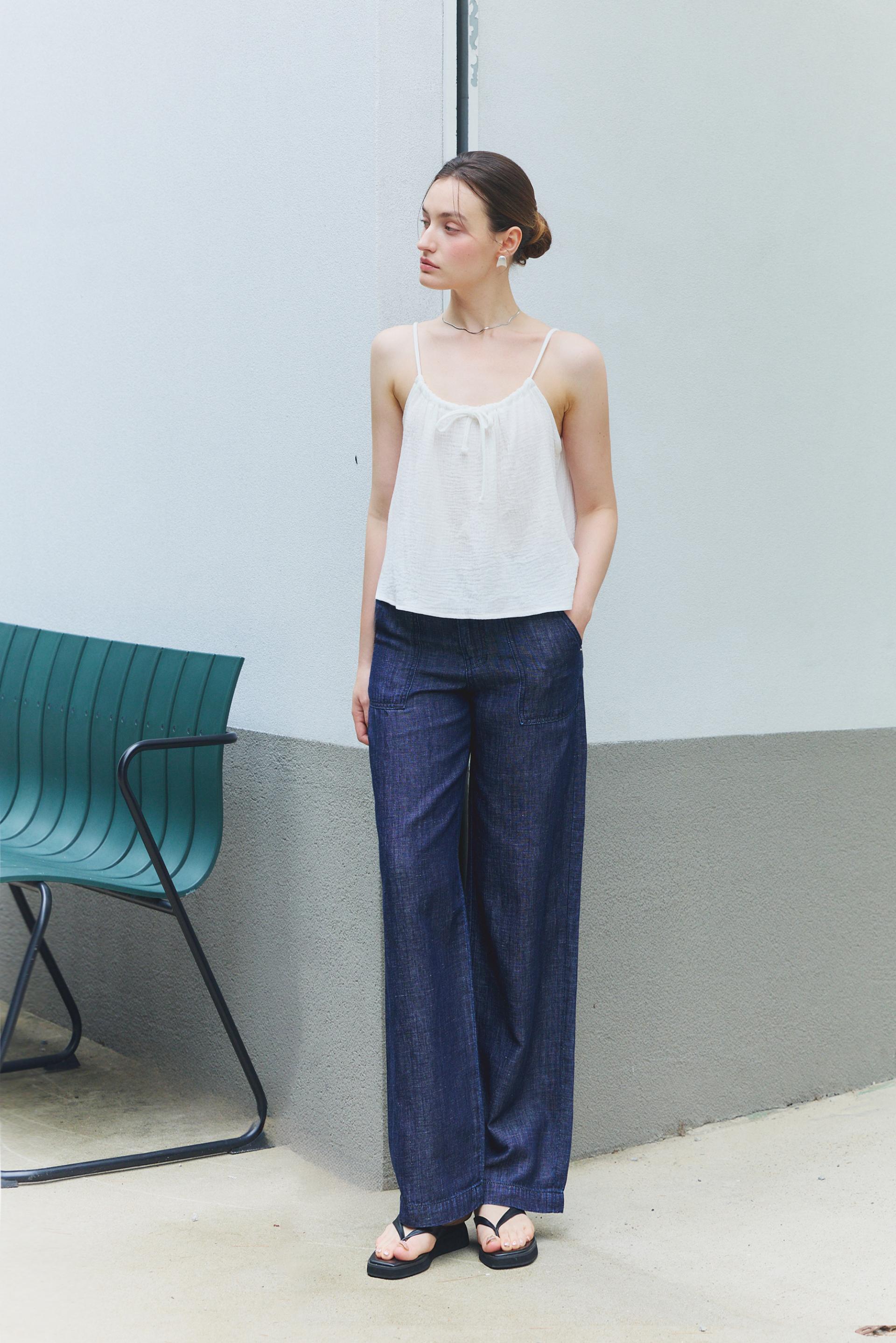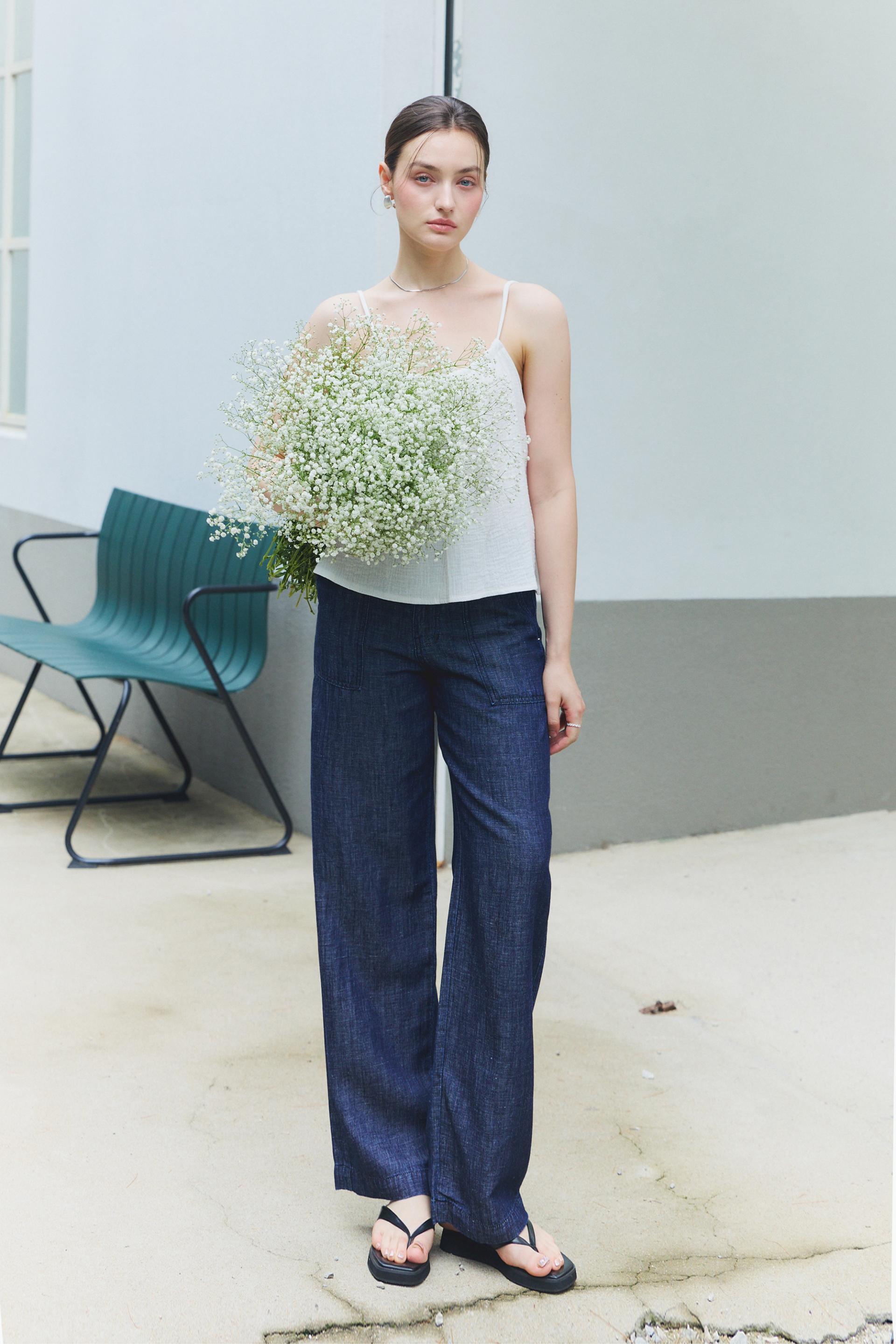 힙라인부터 일자로 떨어지는 실루엣이 다리라인을 길고 곧게 연출해줍니다. 여유로운 실루엣과 내츄럴한 감각으로 일상에 편안함을 즐겨보세요.